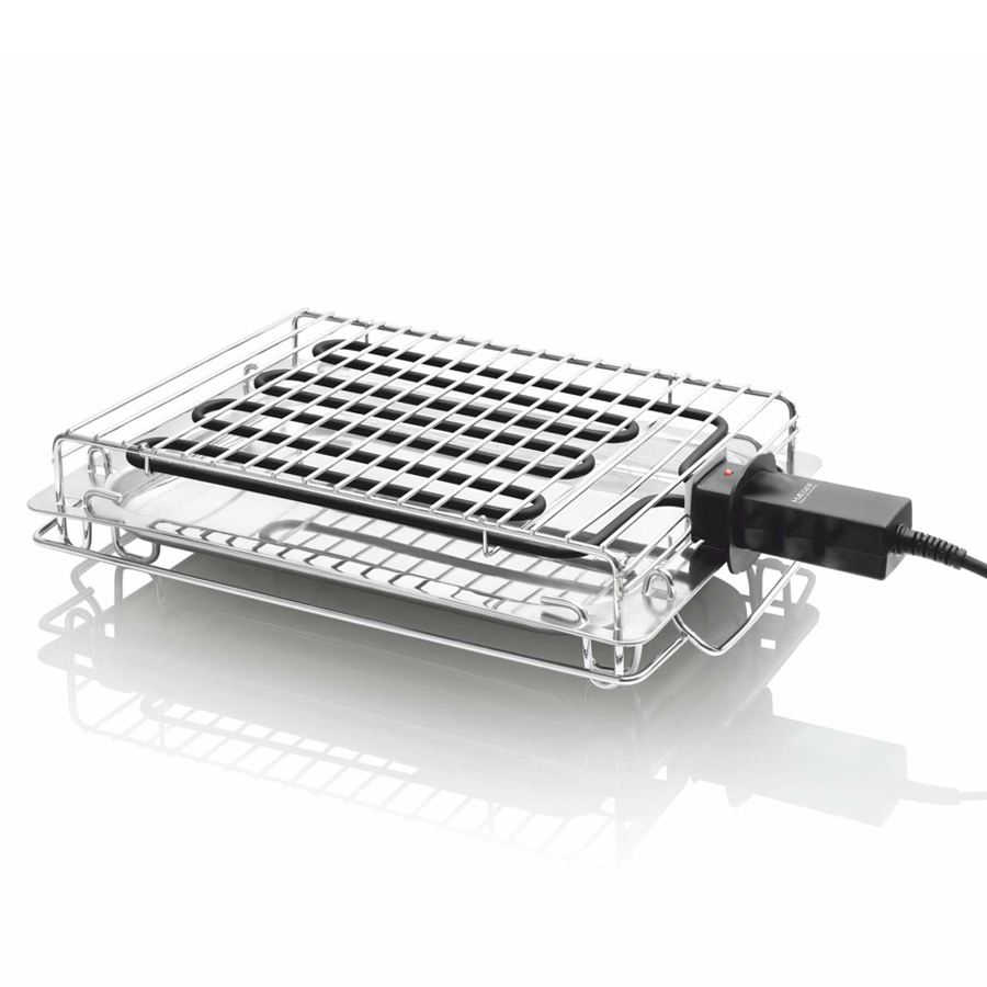 Grelhador de resistência de 2400W, equipado com grelha e tabuleiro de inox desmontáveis, para uma melhor limpeza.