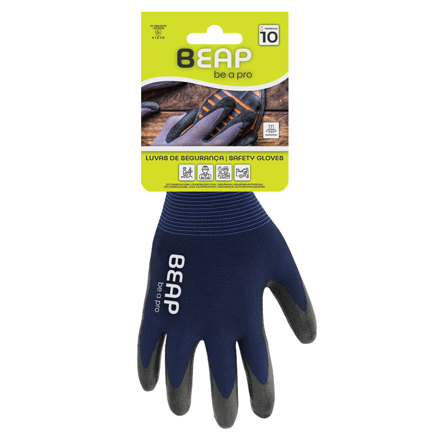 As luvas de segurança da BEAP são feitas de malha de poliester azul, revestidas a nitrilo preto, na palma e ponta dos dedos, com o dorso arejado. Produzidas sem costuras e com a tecnologia breath, garantem a respiração das mãos e um melhor conforto durante o uso. Pemitem um fácil controlo no manuseamento de objetos, quando utilizadas.