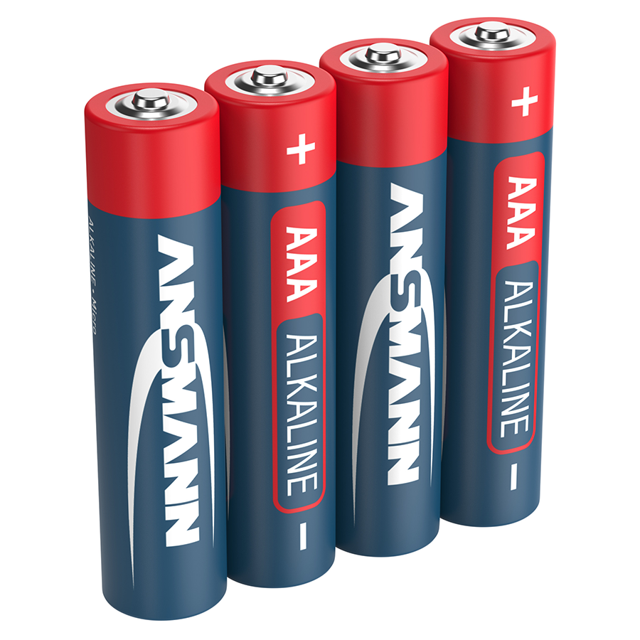 Pilhas AAA LR03 alcalinas da marca Ansmann indicadas para uso diário, disponíveis em embalagens de cartão de 4 e 20 pilhas.